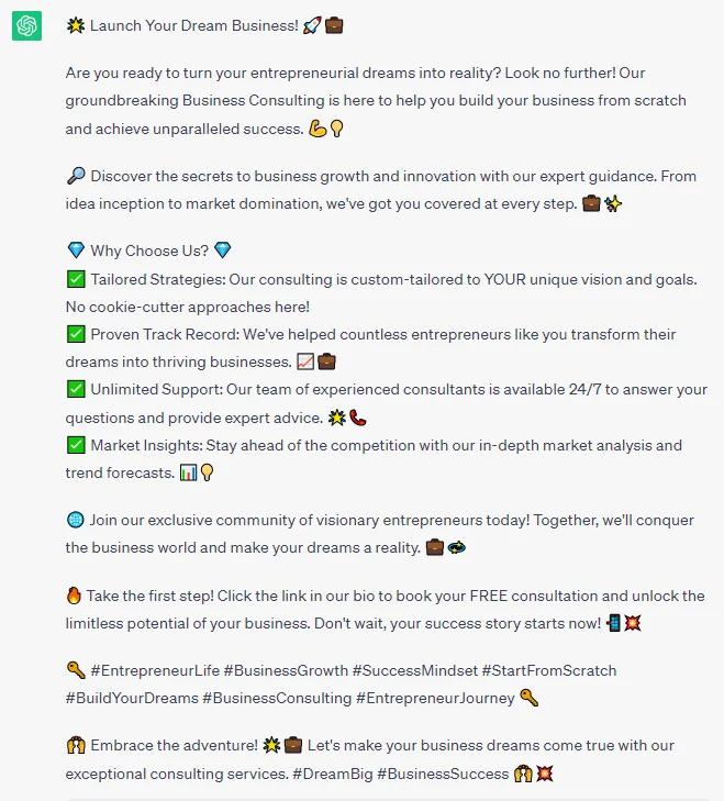 Craft an enticing social media ad for an exciting new Business consulting specializing in helping to build business from scratch. Our target audience consists of entrepreneurs with a keen interest in launching their own business. The ad will be showcased on instagram. To effectively achieve our primary objective of driving new traffic to the brand page and boosting sales, we need an ad copy that captivates the attention of our esteemed entreprenuers. Additionally, a persuasive call-to-action is crucial to inspire them to take immediate action. The ad copy should brilliantly showcase the remarkable business consulting, emphasizing its standout features and undeniable benefits. Let's keep the copy concise and impactful, focusing on the key advantages and unique selling points of our business consulting. It is essential to utilize language that deeply resonates with our valued entreprenuers, effectively addressing their needs and desires. To enhance discoverability among our intended entreprenuers, let's incorporate relevant hashtags that amplify the ad's visibility. Furthermore, the judicious use of relevant emojis will add an extra touch of appeal and excitement to the ad. Kindly create a captivating social media ad that brings our brand and its exceptional business consulting to life, compelling our esteemed entreprenuers to take action.
