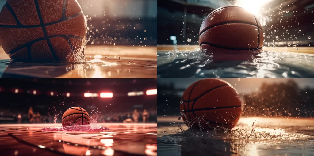 Close-up product shoot of basketball inside miami heat basketball court, water splash, sunlight, hyper-detailed, zoomed, shot on 120mm, shot on Hasselblad, Moody Color grading, –ar 2:1 –v 5
